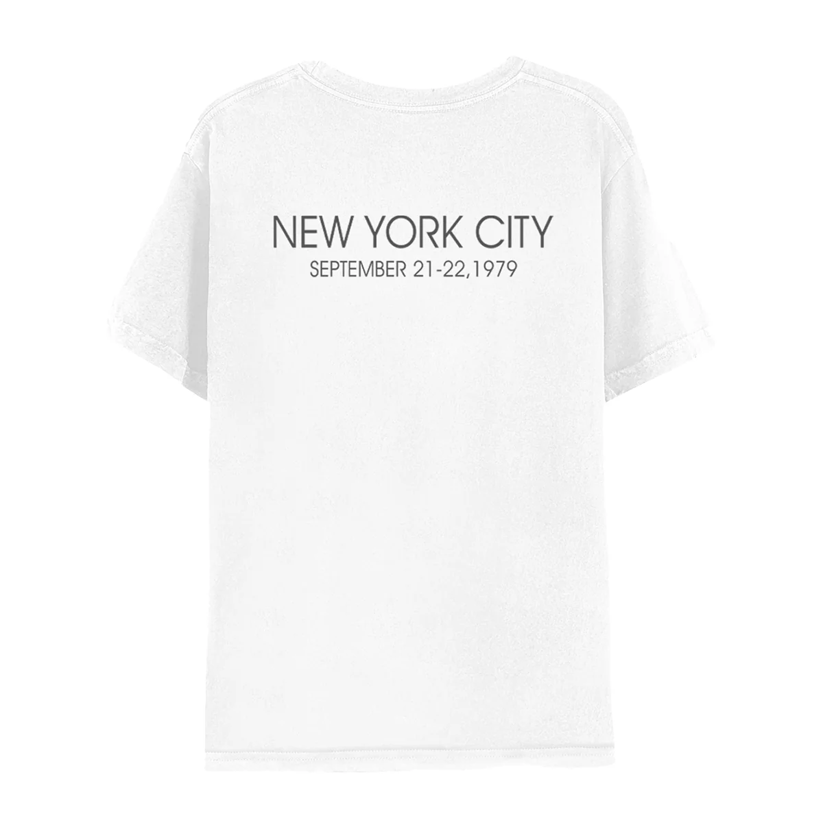 Bruce Springsteen Throwback photo on the front and Springsteen and New York City logo printed on the back of a white, unisex, 100% cotton t-shirt.